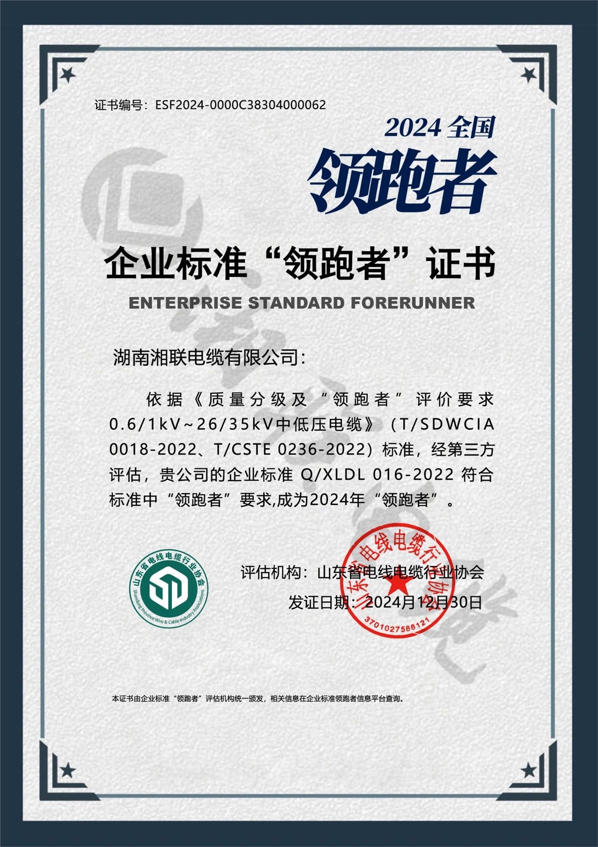 持續(xù)領(lǐng)跑 卓越品質(zhì)|湘聯(lián)電纜再獲企業(yè)標(biāo)準(zhǔn)“領(lǐng)跑者”